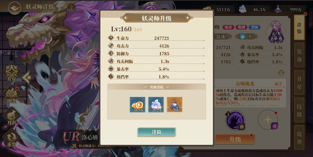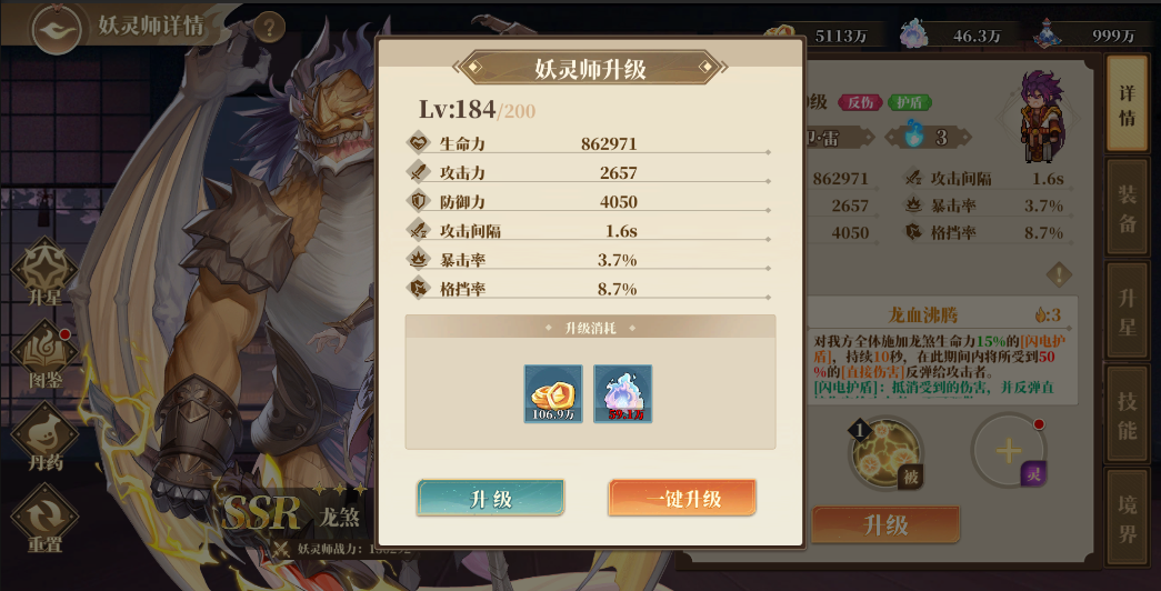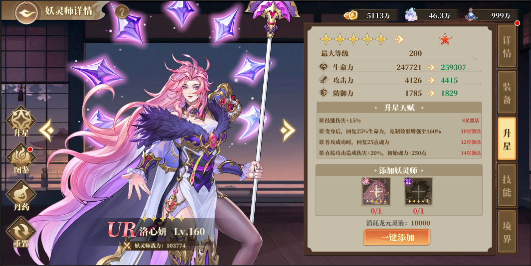 妖靈師可以通過消耗升級材料(妖晶幣、龍元靈液)提升等級,而升級可以提升面板屬性,當達到等級上限時可以通過消耗妖晶幣、龍元靈液和九轉(zhuǎn)丹進階等級上限。不過前期資源有限,還是盡量避免將養(yǎng)成材料分散給太多角色,練好一隊主力隊伍能過主線才是最重要的。?